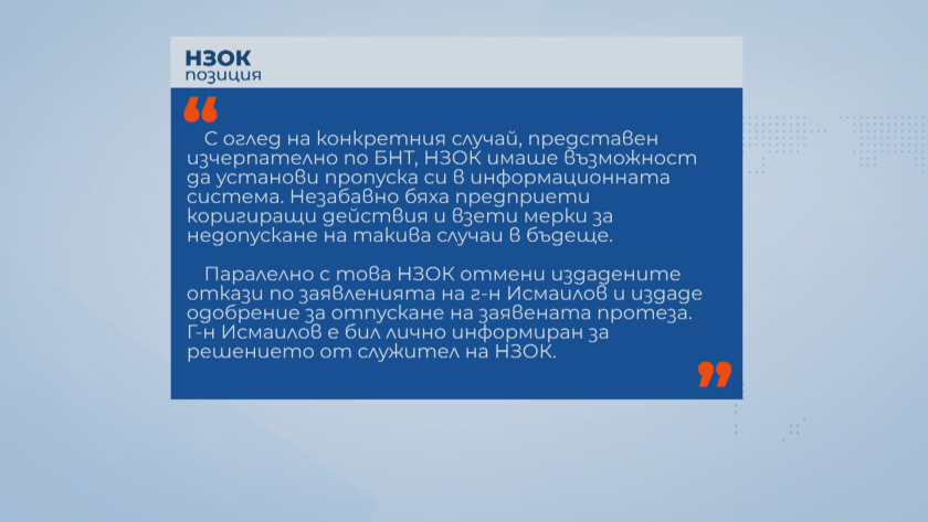 Същевременно от НЗОК обясняват на пациента, че не може сам да представи нужните документи, но и не вземат предвид нанесената корекция, тъй като не е била видима в техния софтуер. В писмо до медиите НЗОК казват, че незабавно са предприели действия за предотвратяване на подобни случаи в бъдеще и вече има издадено одобрение за подмяна на протезата на пациента.