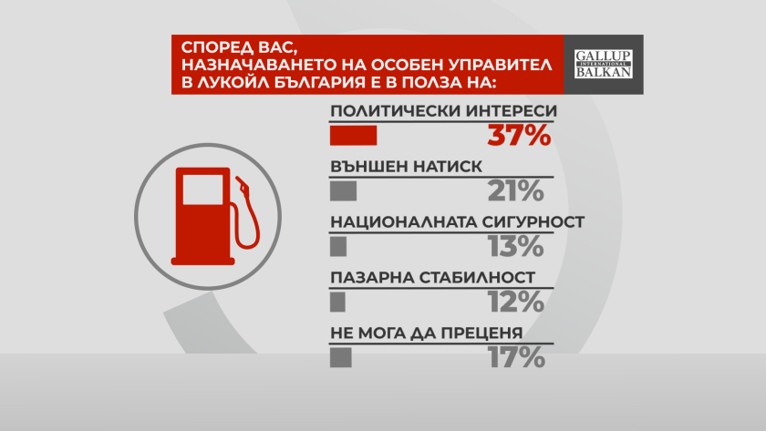 37 на сто отбелязват, че назначаването на особен управител в "Лукойл- България" е в полза на политически интереси. 21% определят външен натиск като основен фактор, докато 13 на сто посочват особения управител като полза на националнаат сигурност.