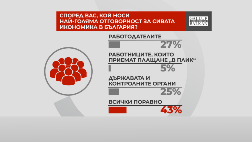 27% от анкетираните в представителното проучване на "Галъп" за предаването "Референдум" смятат, че работодателите носят най-голяма отговорност за сивата икономика в България. 25% са на мнение, че държавата и контролните органи са отговорни. Едва 5 на сто от анкетираните посочват като отговорни работниците, които приемат плащане "в плик". Цели 43% смятат, че отговорността я носят всички поравно.