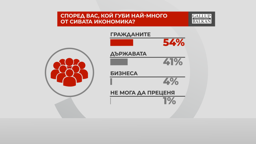 54% от участвалите в анкетата посочват, че гражданите са най-големият губещ от сивата икономика. 41 на сто смятат, че държавата губи най-много дивиденти. Едва 4% са на мнение, че бизнесът страда най-много от сивата икономика.