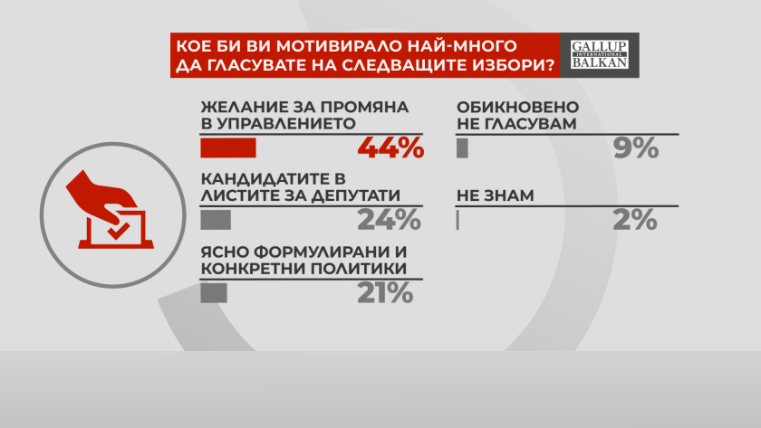 По отношение на мотивацията за участие в следващите избори, най-силният стимул за гласуване е желанието за промяна в управлението, посочено от 44% от участниците. За 24% решаващи са кандидатите в листите за депутати, а 21% биха били мотивирани от ясно формулирани и конкретни политики. В същото време 9% заявяват, че обикновено не гласуват, а 2% не могат да преценят какво би ги мотивирало.
