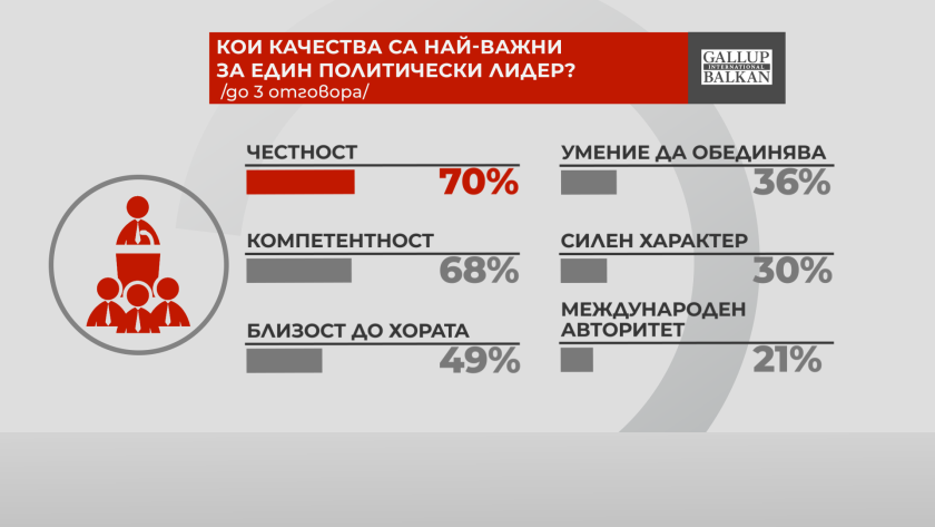 На въпроса кои са най-важните качества за един политически лидер, най-голям дял от анкетираните посочват честността (70%) и компетентността (68%). Почти половината от респондентите (49%) смятат за важно лидерът да бъде близо до хората, а 36% открояват умението да обединява. По-малък дял отдава значение на силния характер (30%) и на международния авторитет (21%).