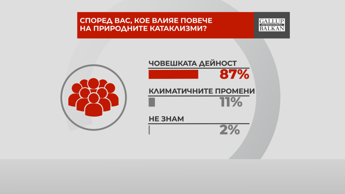 На въпрос кое влияе на природните катаклизми най-голяма част от участвалите в изследването посочват човешката дейност - 87% от анкетираните.
