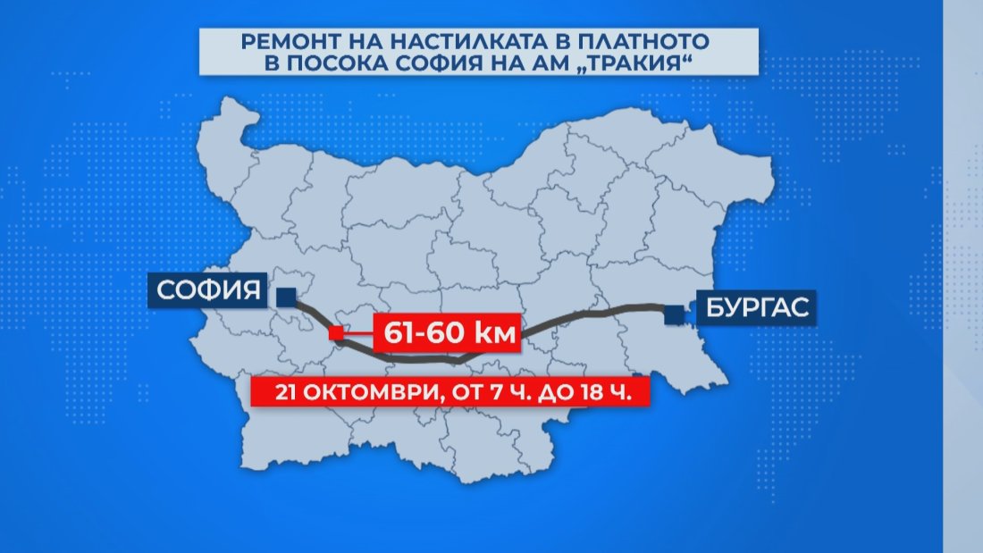 Освен че спират движението през два часа от 12.00 до 18.00 ч. от днес до петък между 7.00 и 18.00 ч. ще се ремонтира настилката в платното за София в участъка от 61-ви до 60-и км.