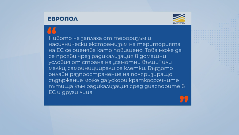 Европол: „Нивото на заплаха от тероризъм и насилнически екстремизъм на територията на ЕС се оценява като повишено. Това може да се прояви чрез радикализация в домашни условия от страна на „самотни вълци“ или малки, самоинициирали се клетки. Бързото онлайн разпространение на поляризиращо съдържание може да ускори краткосрочните пътища към радикализация сред диаспорите в ЕС и други лица.“