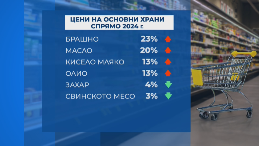 На годишна база по-значително е поскъпването при брашното - с 23%, маслото - с 20 на сто, киселото мляко и олиото - с 13%. Захарта и свинското месо са поевтинели в сравнение с миналата година. В сравнение с миналата година обаче значително са поскъпнали плодовете - ябълките с 56%, прасковите с 48 на сто, лимоните с 26 процента.
