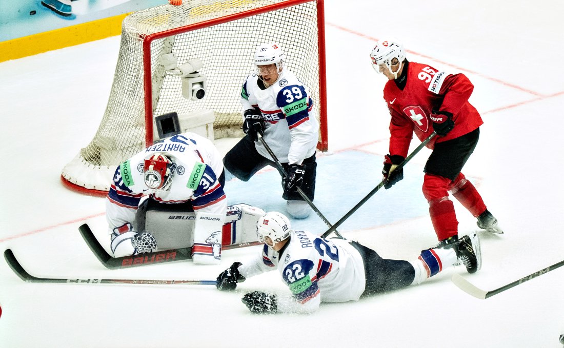 В група Б световният вицешампион Швейцария се наложи над Норвегия с 3:0 с голове на Свен Андригето, Грегори Хофман и Тайлър Мой и също продължава напред. Швейцарците имат 13 точки от пет мача и водят в класирането в група Б.