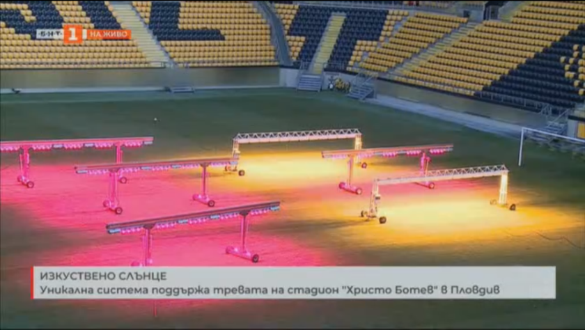 Тревната настилка се наранява лесно, защото стадионът е от затворен тип и слънцето не успява да достигне пълноценно до тревата. Така в Пловдив пристигна първата в България иновация за изкуствено слънце.