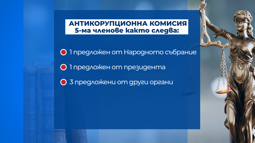 Андрей Янкулов – служебен вицепремиер и министър на правосъдието: "Народното събрание и президента номинират по един член на комисията от 5-членния ѝ състав и останалите членове се номинират от органи, които не са политически. Това е една композиция на антикорупционния орган, която е консултирана с ЕК като именно отговаряща на изискването на ПВУ за независим политически антикорупционен орган.