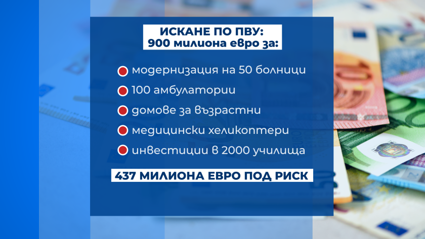 Пари срещу реформи – това е принципът на Плана за възстановяване и устойчивост. Зад тези 900 милиона евро, които можем да получим, стоят над 2 500 инвестиции в ключови сектори. Това са проекти за модернизация на над 50 болници, 100 амбулатории в отдалечени населени места, изграждане на нови домове за възрастни хора, медицински хеликоптери и хангарите за тях, както и СТЕМ центрове в над 2000 училища. Заради липса на реформи във ВиК сектора над 400 милиона евро са под риск.