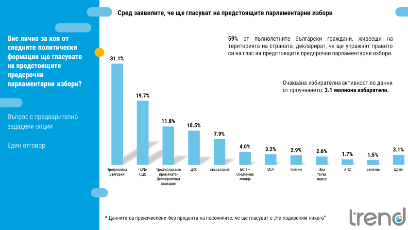 59% от пълнолетните българи, живеещи на територията на страната, заявяват, че ще упражнят правото си на глас на парламентарните избори. Това означава, че се очакват около 3,1 милиона български граждани пред урните на 19 април. Изводите са от проучване на агенция "Тренд" по поръчка на "24 часа", посветено на електоралните нагласи спрямо предстоящите предсрочни парламентарни избори.