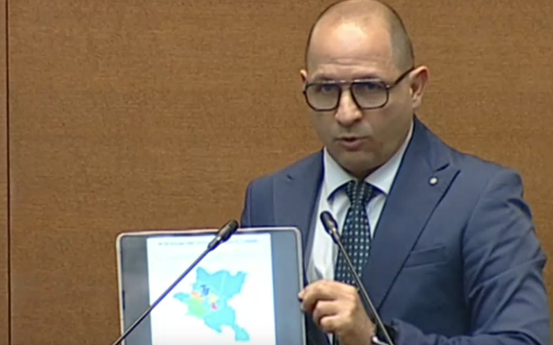 Младен Шишков, ГЕРБ-СДС: "Това в синьото, колеги, това е фирмата, която в момента почиства София с анекси. Ето я. 5 от 9 зони или 3/4 от територията на града. Какво точно направи Васил Терзиев в борбата с хората с прякори. Какво точно направи. Ето - 3/4 от София се почиства от тях."