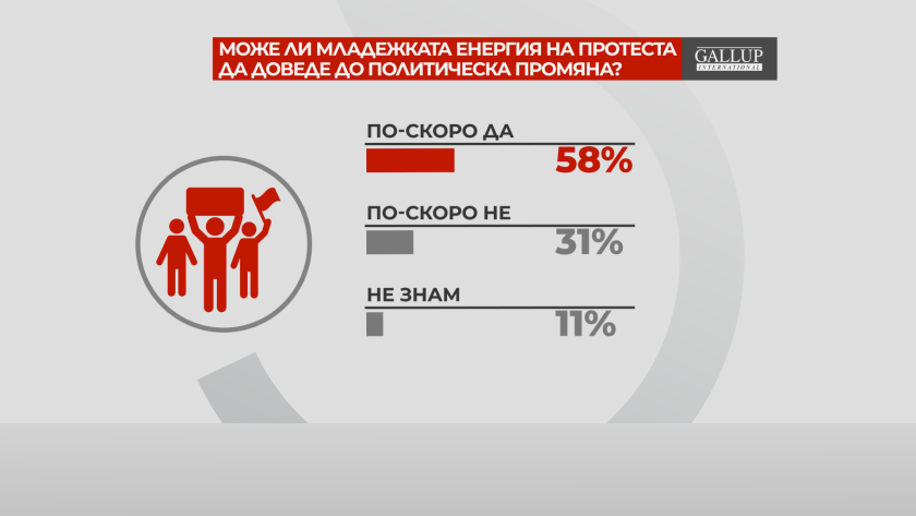 58 на сто от анкетираните смятат, че младежката енергия на протеста ще доведе до политическа промяна. Всеки трети е на мнение, че няма да има такава промяна. С "не знам" отговарят 11%.