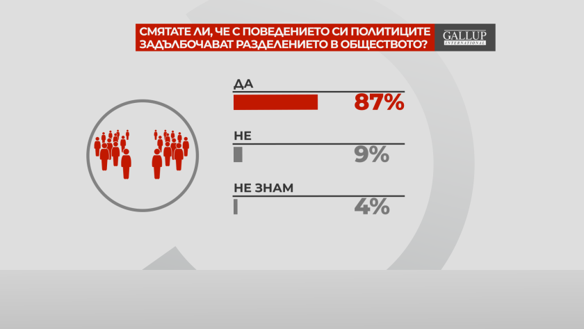 Хората категорично смятат, че с поведението си политиците задълбочават разделението в обществото (87%).
