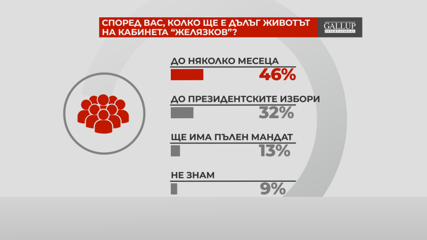 46% от българите смятат, че кабинетът "Желязков" ще продължи работа още няколко месеца. Това показва проучване на "Галъп Интернешънъл Болкан" за предаването "Референдум". 32 на сто са на мнение, че правителството ще оцелее до президентските избори.