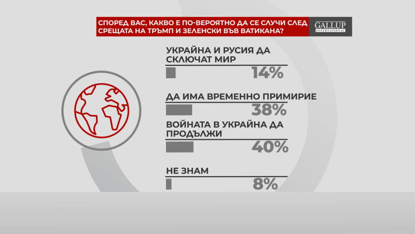 40% от допитаните са на мнение, че войната в Украйна ще продължи и след срещата на американския президент Доналд Тръмп с Володимир Зеленски във Ватикана. 38 на сто са на мнение, че може да има временно примирие, а 14% мислят, че Украйна и Русия ще сключат мир.