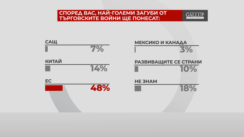 48% от анкетираните мислят, че най-големи загуби от търговските войни ще понесе Европейският съюз. Според 14% те ще са за Китай. 10 на сто от допитаните мислят, че развиващите се страни ще имат най-големи загуби.