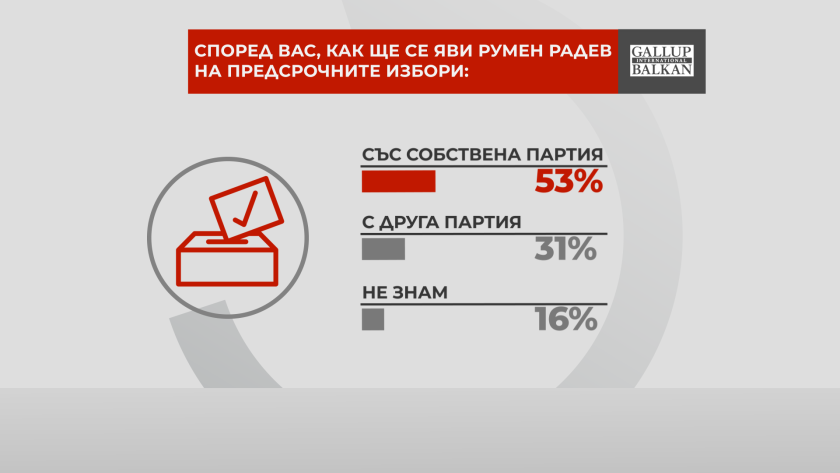 Повечето от участвалите в проучването – 53% смятат, че Румен Радев ще се яви на изборите със собствена партия, според 31 на сто – това ще стане с с друга партия.
