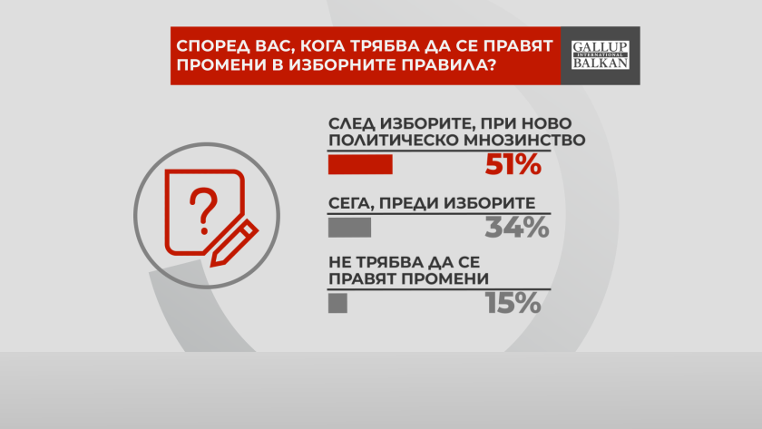 Относно предстоящите избори и обсъждането на промените в Изборния кодекс, голяма част от анкетираните смятат, че промени в изборните правила трябва да се правят след изборите, при ново политическо мнозинство. Такова е мнението на 51 на сто. "За" промените сега, преди вота, са 34%.