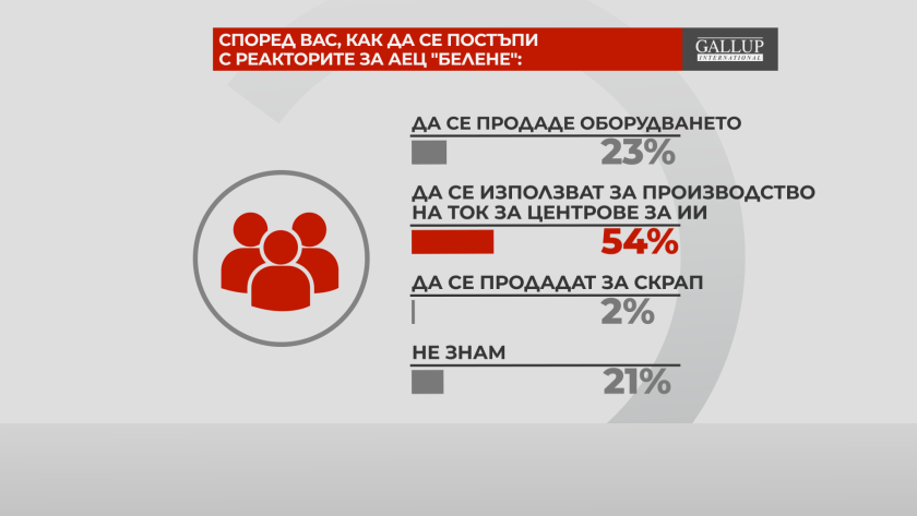 Според анкетираните в проучването на "Галъп интернешънъл" за предаването "Референдум" 54% смятат, че реакторите за АЕЦ "Белене" трябва да се използват за производство на електроенергия за центрове за изкуствен интелект.