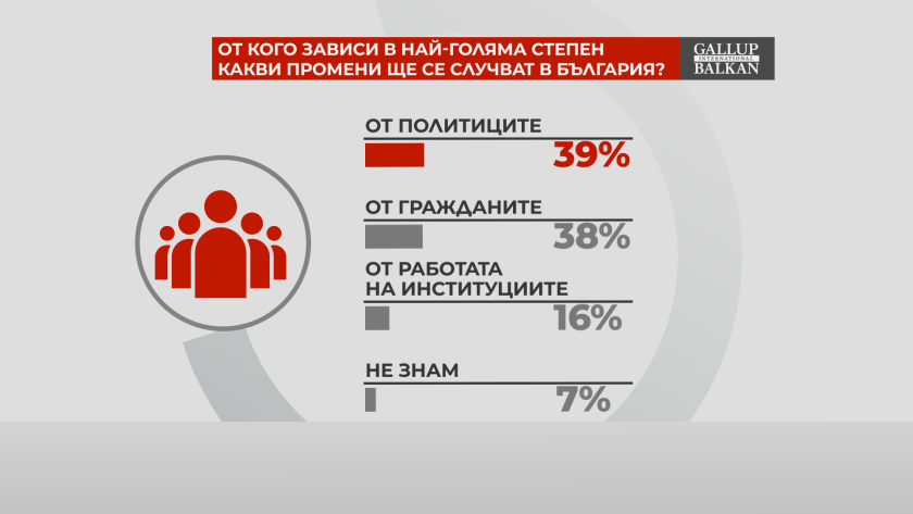 Хората са на мнение, че и от политиците, и от гражданите в най-голяма степен зависи какви промени ще се случват в България. 16 на сто смятат, че най-важна в това отношение е работата на институциите.