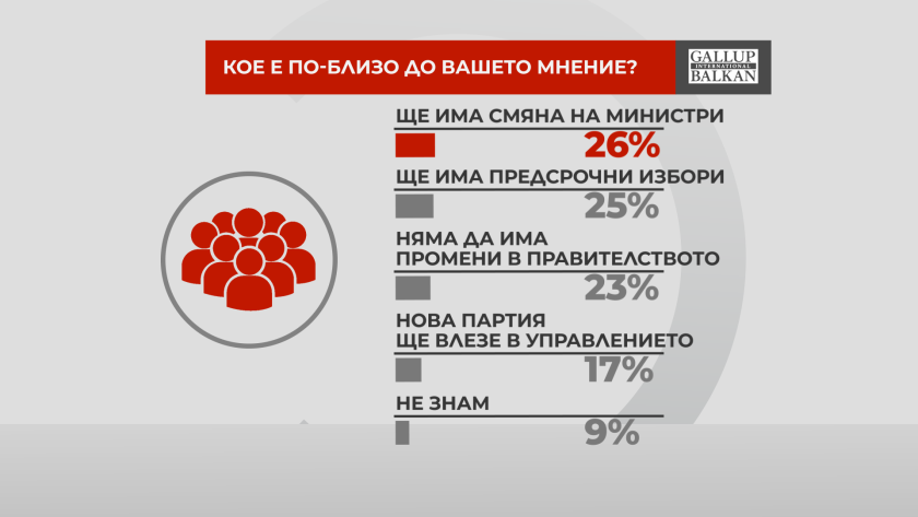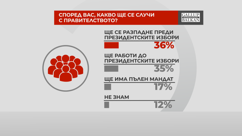 36% от запитаните са на мнение, че правителството ще се разпадне преди президентските избори, 35 на сто - че ще работи до президентските избори, а 17% - че ще изкара пълен мандат.