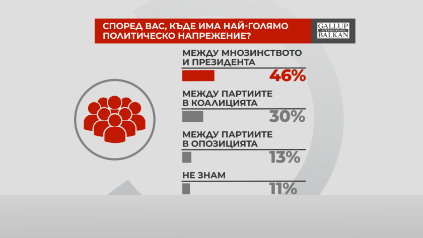 На въпроса къде има най-голямо политическо напрежение, 46 на сто са отговорили, че то е между управляващите и президента, 30% - между партиите в коалицията, а 13 на сто - между опозиционните партии.