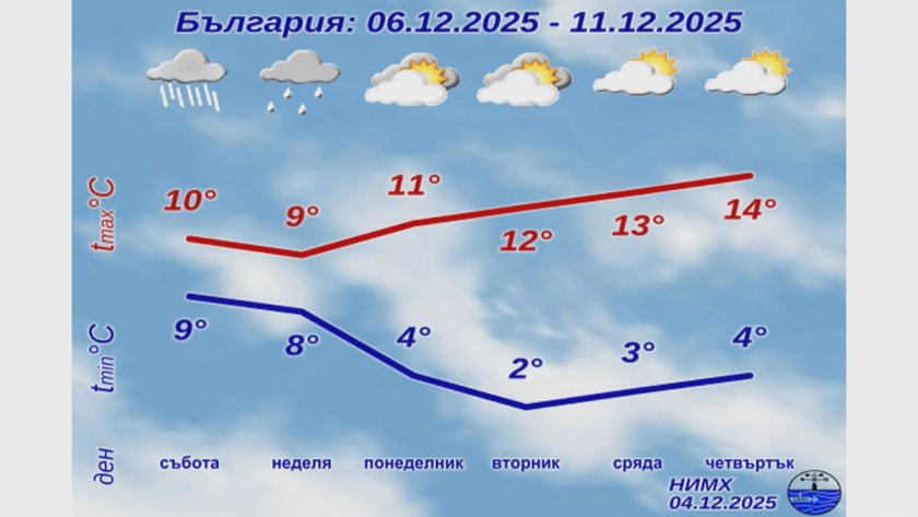 За Никулден дъжд ще обхване цялата страна, а от неделя валежите постепенно ще отслабват от запад. Тенденцията за следващите дни сочи максимални температури между 10 и 15 градуса и липса на зимни условия в низините.