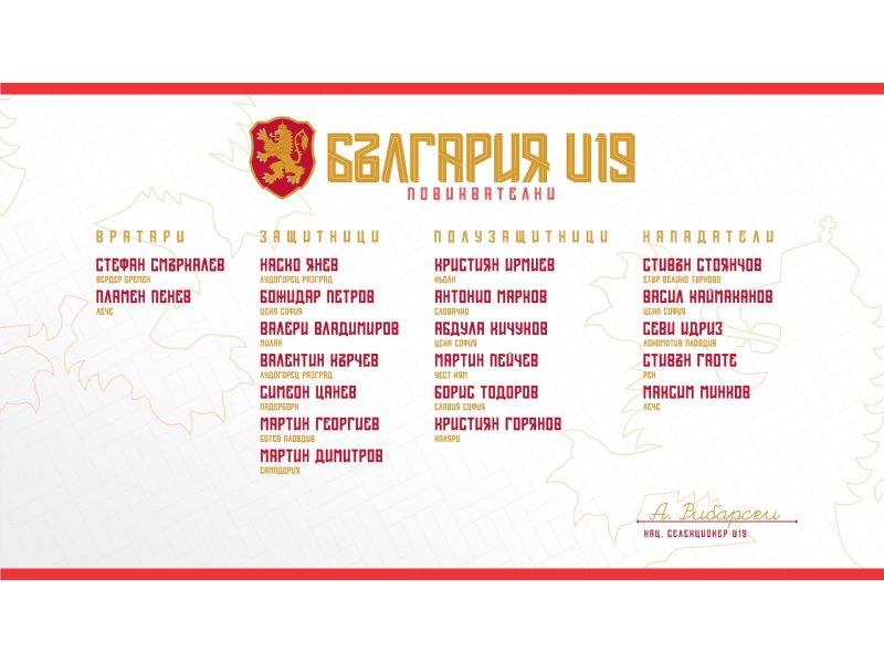 Селекционерът на България U19 Атанас Рибарски определи разширения състав за двете приятелски срещи с Молдова край Кишинев. Мачовете ще се изиграят в рамките на 3 дни, първият от които е на 11 октомври от 15 часа, а вторият е на 14-и от 10 часа.