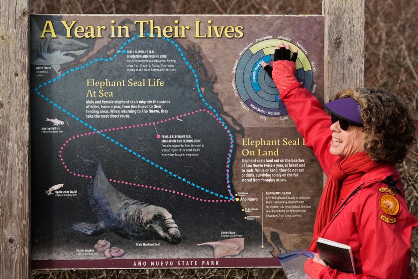 "Повечето морски слонове се връщат на същия плаж, на който са родени. Не всички, но повечето от тях. В нашия парк имаме около 10 000 морски слона", казва екскурзоводката Лаура Стърн.