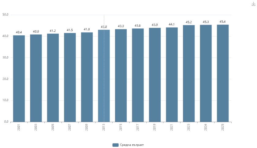 Застаряването на населението през годините води до повишаване на неговата средна възраст, която нараства до 45.4 години в края на 2025 година. Средната възраст на населението в градовете е 44.6 години, а в селата - 47.7 години.