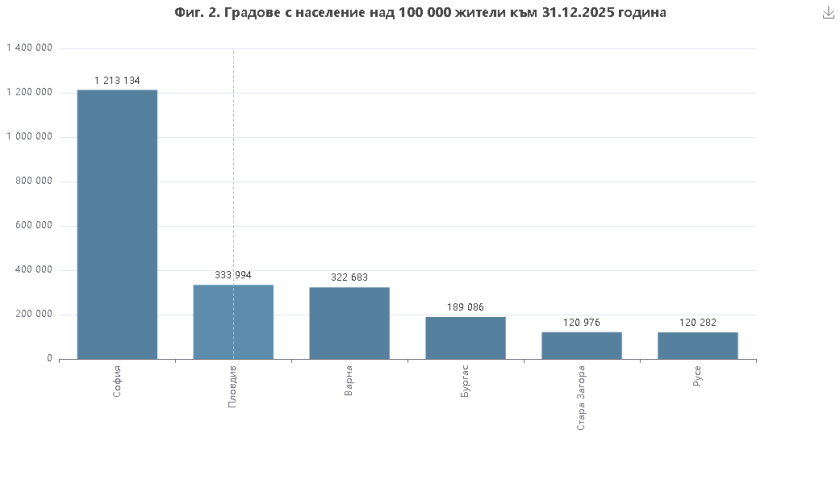 Към 31 декември 2025 г. населението на България е 6 423 207 души.Това съобщиха от Националния статистически институт.