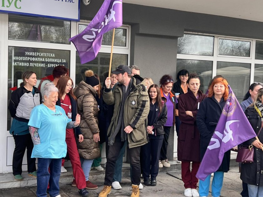 Протест на медицински специалисти се проведе пред УМБАЛ–Бургас. Медицински сестри, акушерки, лаборанти и рехабилитатори излязоха с протестни ленти и знамена, настоявайки за достойно заплащане и ясни правила за формиране на възнагражденията през 2026 година.