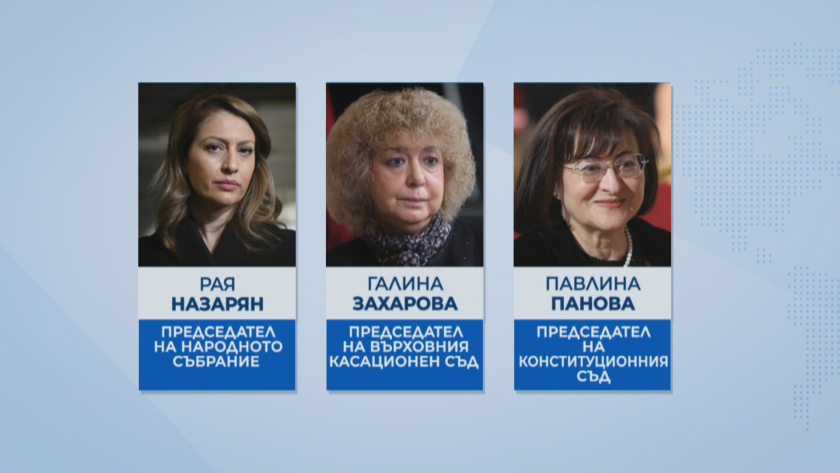 Новият президент допълва карето дами, начело на ключови институции. Сред тях са Рая Назарян - председател на Народното събрание, Галина Захарова, която оглавява Върховния касационен съд, и Павлина Панова, председател на Конституционния съд на Република България.